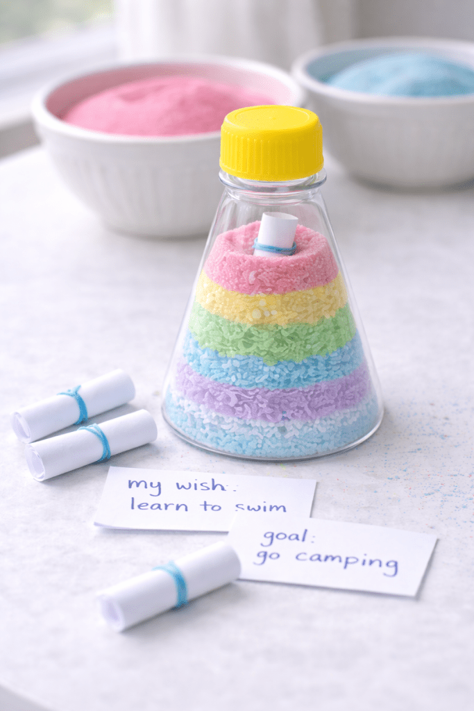 Set out jars along with funnels, scoops, or spoons to make layering easier (and a little less messy). If you’re using printables, place the memory ideas list nearby so kids can decide what each color will represent as they go.
