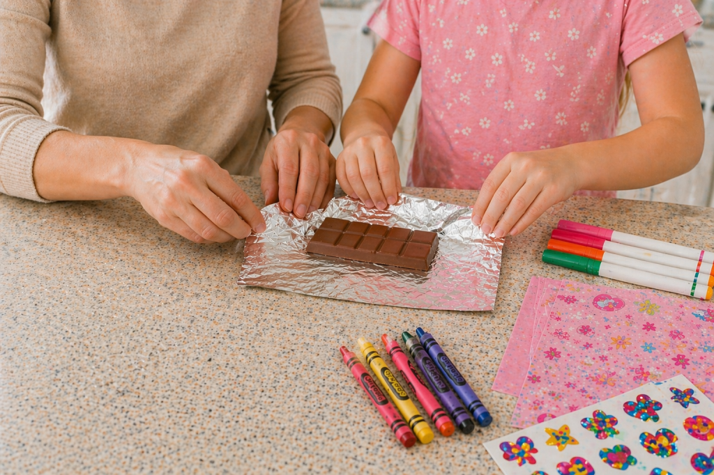While waiting for chocolate to set, let kids decorate their wrappers with markers, crayons, and stickers. They can name their chocolate bar, design a logo, or even write ingredients on the back. If you are celebrating a special occasion, they can add that, maybe Happy Birthday, #1 Mom, or Best Dad. These can really be used for any occasion.